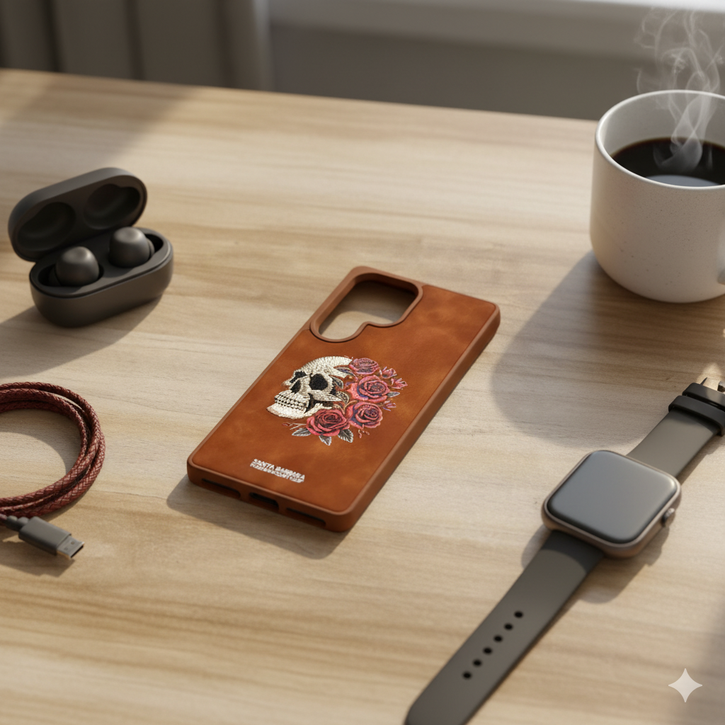 Elevate the look of your Samsung S25 Ultra with this luxury brown leather case featuring 3D Skull & Roses embroidery. Designed for those who appreciate bold aesthetics and premium craftsmanship, this case adds a stunning artistic touch while offering full protection against drops, scratches, and daily wear.