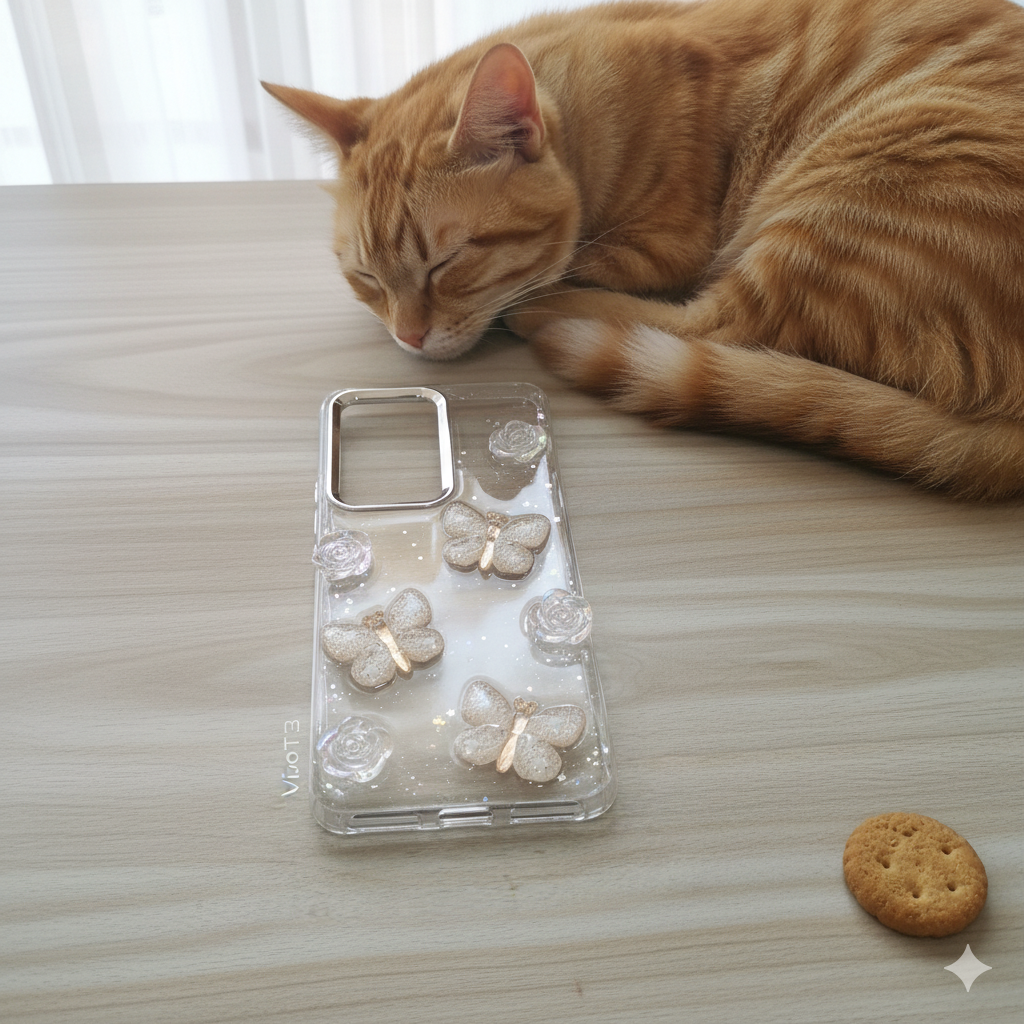 Add a touch of elegance and charm to your Vivo T3 with this 3D Butterfly & Rose Transparent Case. Crafted with soft, durable TPU material, it provides protection while maintaining a sleek and feminine look. The case features glitter accents, 3D butterflies, and crystal rose decorations that shimmer beautifully under light, giving your phone a premium and stylish appeal.